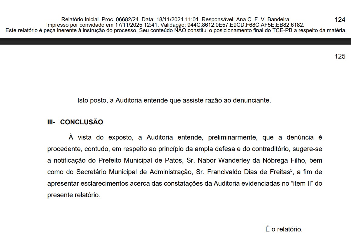 Diante das falhas identificadas, o TCE-PB concluiu que a denúncia é preliminarmente procedente. No entanto, antes de qualquer deliberação final, o órgão determinou a notificação do prefeito Nabor Wanderley e do secretário Francivaldo Dias de Freitas para que apresentem defesa e esclarecimentos. O relatório reforça que a avaliação ainda não representa o posicionamento final do Tribunal.