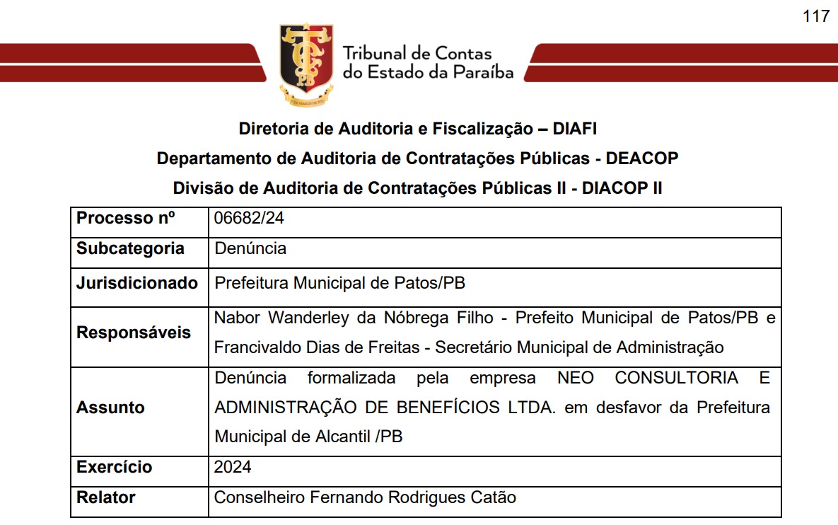 O processo, registrado sob nº 06682/24, tem como responsáveis o prefeito Nabor Wanderley e o secretário de Administração, Francivaldo Dias de Freitas, que também atuou como autoridade homologadora da licitação. O relatório inicial foi assinado pela auditoria do TCE-PB, ligada à Diretoria de Auditoria e Fiscalização (DIAFI), e tem como relator o conselheiro Fernando Catão.