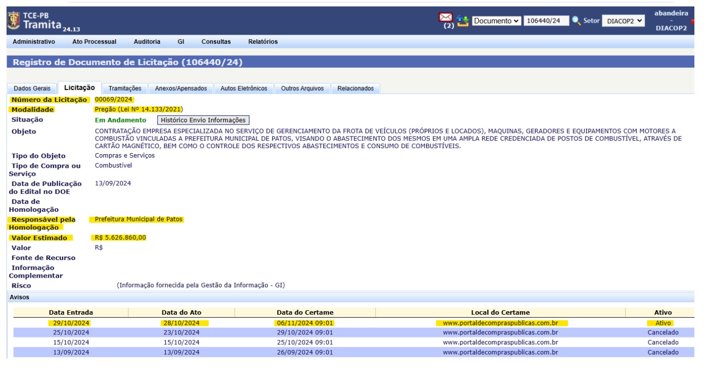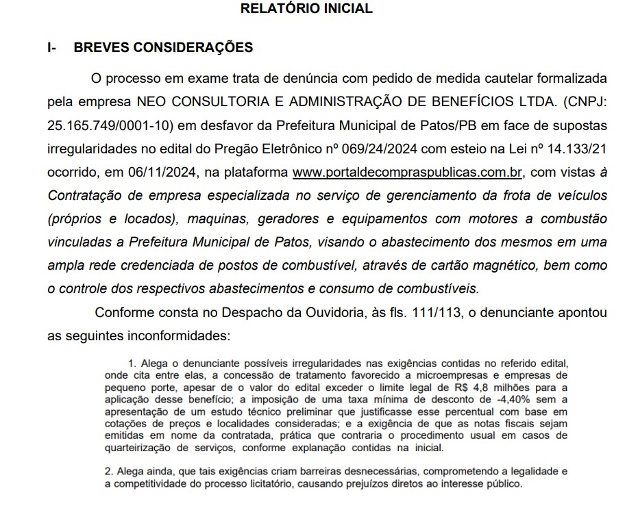 O Tribunal de Contas do Estado da Paraíba (TCE-PB) identificou possíveis irregularidades no Pregão Eletrônico nº 069/2024, da Prefeitura de Patos, destinado à contratação de empresa para gerenciamento da frota municipal, com valor estimado em R$ 5.626.860,00. O caso foi levado ao órgão por meio de denúncia da empresa NEO Consultoria e Administração de Benefícios Ltda., que apontou ilegalidades no edital e pediu a suspensão do certame.